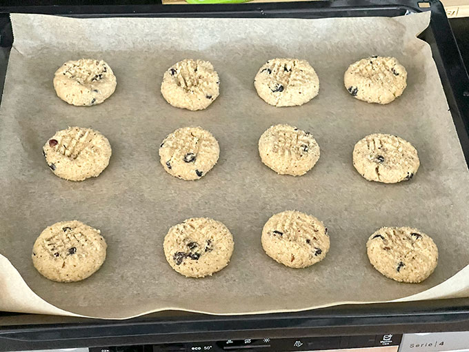 Po schłodzeniu ciasta wyjmij je z lodówki. Za pomocą łyżki do ciastek o pojemności 1,5 łyżki stołowej nabieraj ciasto i formuj kulki i układaj na blasze. Ja upiekłam z dwóch takich porcji i wyszło 34 ciasteczek, całkiem sporych. Na koniec delikatnie dociśnij kulki widelcem albo dłonią, aby lekko je spłaszczyć. Między kulkami zostaw większy odstęp, ponieważ ciasto zwiera sporo masła i podczas pieczenia nieco się rozpłynie. Soda rowniez spowoduje zwiększenie ich objętości wyłożonego ciasta.