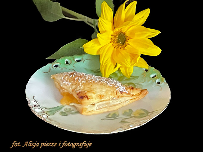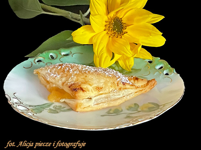 Przepiękne ciastka z ciasta francuskiego, smaczne jak każde wypieki z tego ciasta no i bardzo łatwe, i szybkie do stworzenia coś lekkiego do kawy. Polecam od razu zrobic z podwójnej porcji ciasta, bo gdy zniknie te 9 sztuk z talerza nikt nie jest pewien, czy zdążył złapać smak😁Po prostu ciasteczka rozpływają sie w ustach już po ugryzieniu 😊