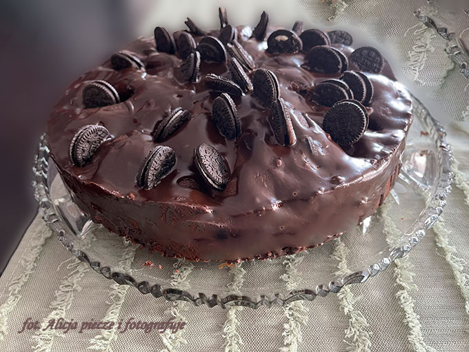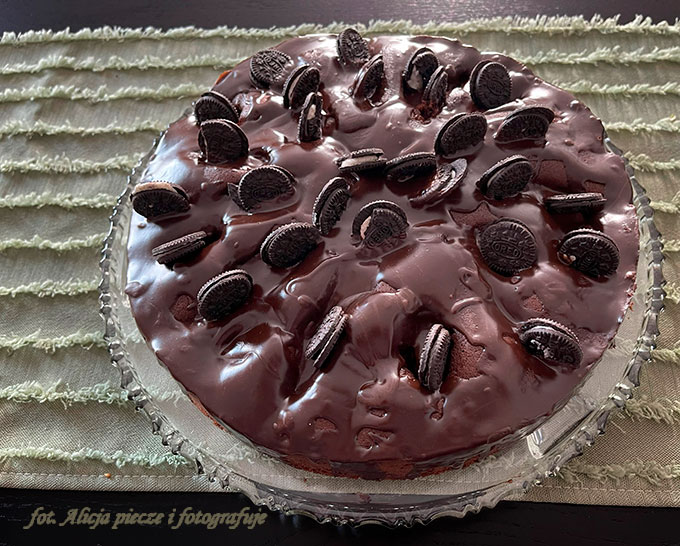 Obierz gruszki, pokrój je na ćwiartki i wydrąż gniazda nasienne. Utrzyj masło, cukier i cukier waniliowy mikserem elektrycznym na puszystą masę. Stopniowo dodawaj jajka. Wmieszaj letnią śmietankę czekoladową. Na koniec wymieszaj mąkę z kakao i proszkiem do pieczenia, a następnie wmieszaj do ciasta. Wlej ciasto do przygotowanej formy. Ułóż pokrojone na ćwiartki gruszki na wierzchu masy ciasta lekko je wciskając. Piecz przez około 40 minut. Pozostaw ciasto do całkowitego ostygnięcia. Następnie rozgrzej 100 g gorzkiej czekolady ze 100 g śmietanki, umieszczając oba składniki jednocześnie w misce na gorącej wodzie. Nigdy nie wlewaj zimnej śmietanki do gorącej czekolady! Polej masą czekoladową całe ciasto i ułóż ciasteczka Oreo.