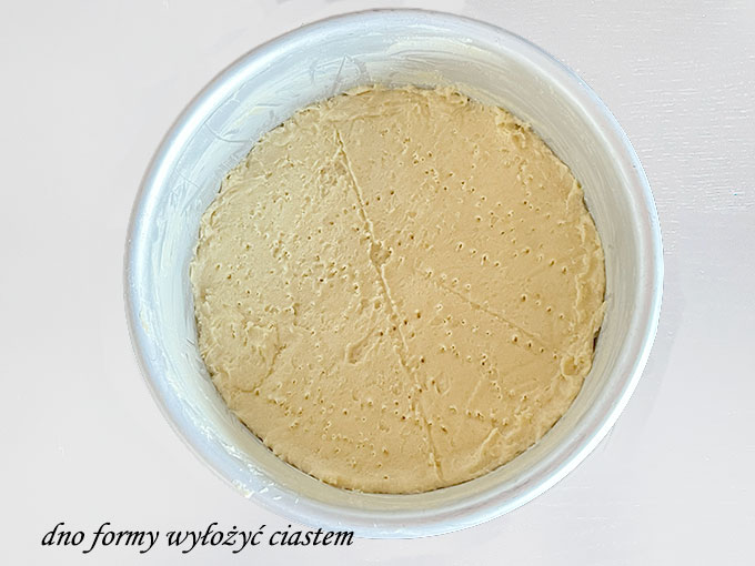 Ciasto wykleić na dnie przygotowanej formy i nakłuć widelcem. Można rozłożyć ciasto na wyciętym kole papieru do pieczenia, położyć kawałek folii przezroczystej i rozwałkować je na wymiar tego koła. Wyśmienicie się sprawdza, ciasto pod serową warstwą będzie idealnie równe. Podpiec w nagrzanym piekarniku do lekkiego zarumienienia, ok. 15 minut w temperaturze 180°C góra- dół. Wystawić z piekarnika i pozostawić do przestygnięcia.