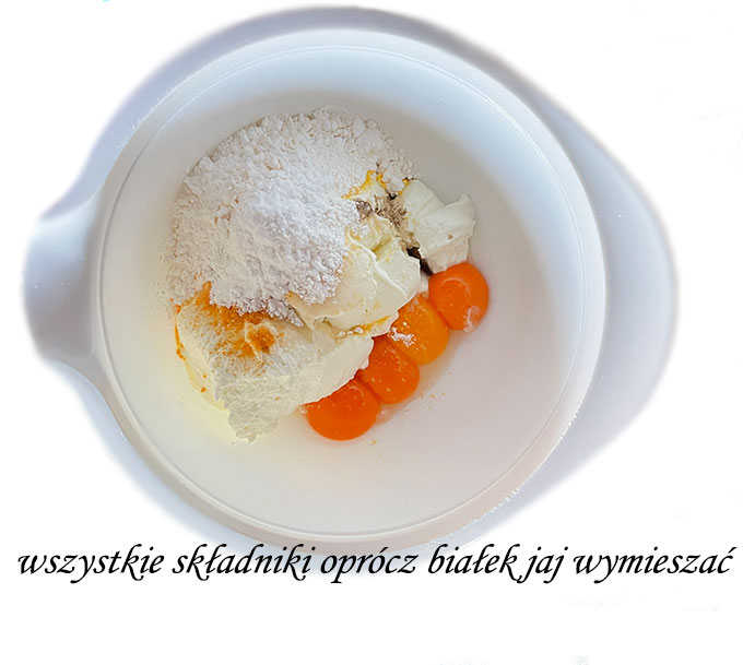 Białka oddzielić od żółtek. Wszystkie składniki z wyjątkiem białek wymieszać w misie miksera lub ręcznie. Białka ubić na sztywno dodać do masy serowej i delikatnie łopatką silikonowa wymieszać.