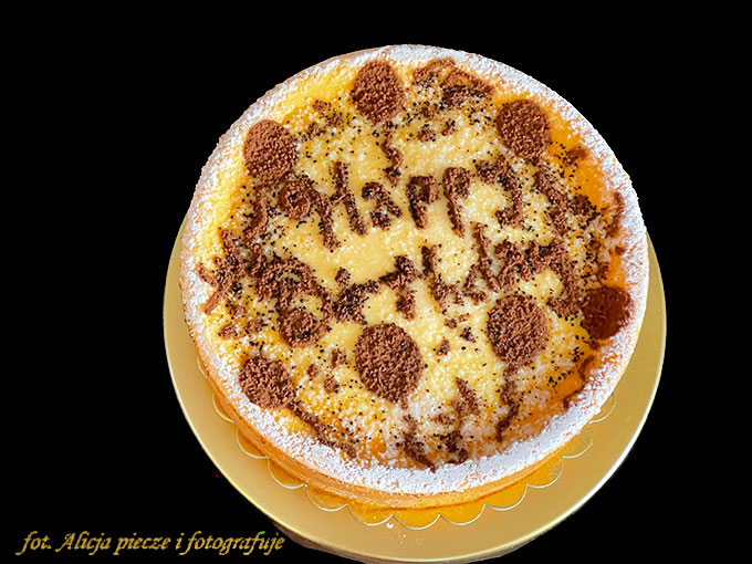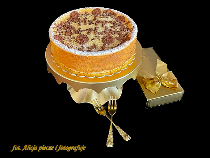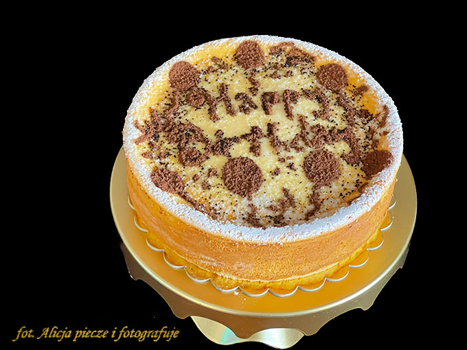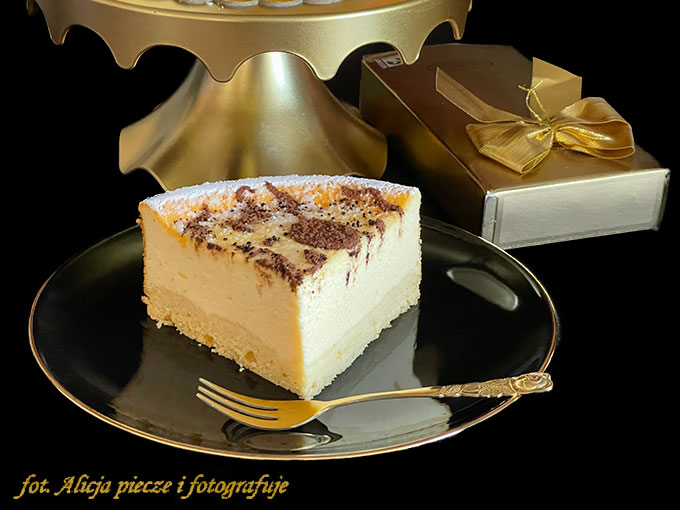 Masę serową wyłożyć do tortownicy i wyrównać. Ilość masy serowej sięga wysoko w tortownicy, ale nich to nie przeraza bo sposobem przyrządzenia a potem metodą pieczenia nie pozwolimy mu niepotrzebnie przerosnąć, aby potem opaść. Piec w nagrzanym piekarniku do 200°C 15 minut, następnie zmniejszyć temperaturę do 150°C i piec ok. 1 godziny góra- dół na dolnej szynie. Wyłączyć piekarnik, uchylić drzwiczki piekarnika wypuszczając parę z niego i studzić sernik przy lekko uchylonych drzwiczkach. Chłodny, lub zimny sernik posypać cukrem pudrem. Ja sernik stawiam w zimnej piwnicy na półkę, tam nie rozpuszcza się cukier puder lub glazura, i sernik jakby dojrzewa, smaki się przenikają i sernik nabiera wytrawnego, i wspaniałego smaku. Jeśli nie masz takiej możliwości, wstaw do lodówki, ale 2 godziny przed podaniem wyjmij sernik z niej. Sernik prosto z lodówki jest sztywny, o zimnej i pozbawionej smaku pajdzie sera. Ten sernik jest o jedwabistej konsystencji i niepowtarzalnym smaku, po prostu poezja.