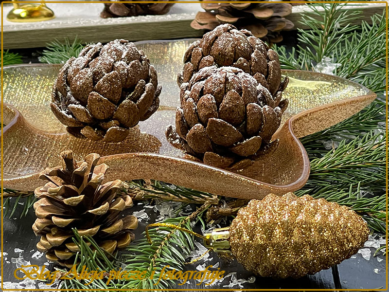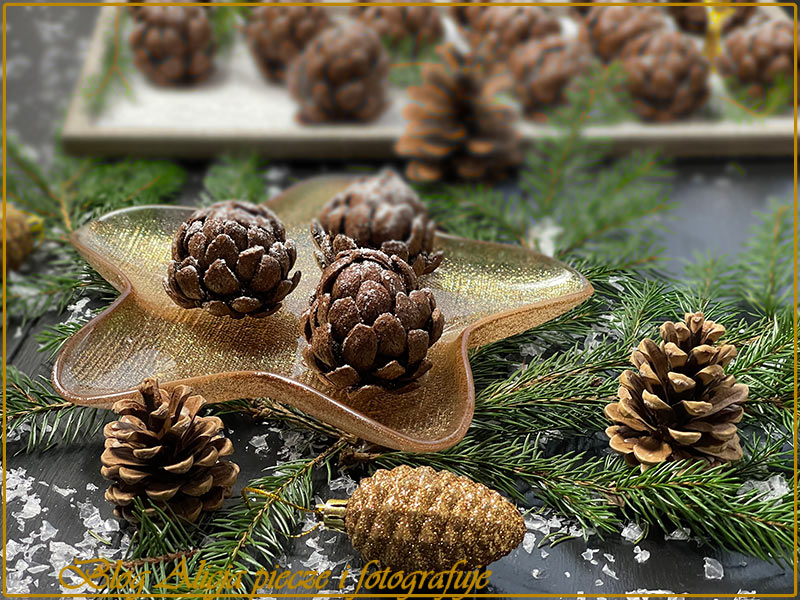 Bez pieczenia, – to zazwyczaj kojarzy się także z zaoszczędzonym czasem, ale nie w tym wypadku. Łuski szyszek, które trzeba pojedynczo umieścić w kulce, a u mnie jest ich około 30 sztuk na jedna szyszkę, wymaga sporo czasu. Jednakże efekt wprawia absolutnie w stan zadowolenia i samouwielbienia. 😂Szyszki te nie tylko będą rozdane na upominki świąteczne, ale kilka z nich wyląduje na ciastach świątecznych jako własnoręczna dekoracja. Polecam i zapraszam po przepis!