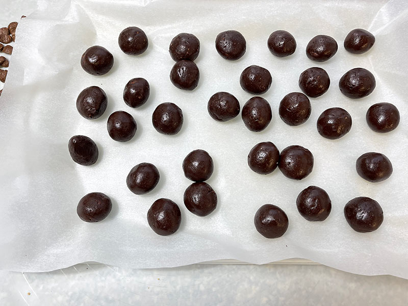 Herbatniki /jak widać na zdjęciu/dobrze rozdrobnić wałkiem, albo jakimś urządzeniem elektrycznym. Dodać wszystkie inne składniki i wymieszać mikserem, albo ręką. Moja rada jest jednak ręką, ponieważ lepiej jest, gdy nie ma większych kawałków w masie, które potem utrudniają wtykanie kruchych płatków. Dlatego też, mimo że byłyby szyszki smaczniejsze z bakaliami, ale te analogicznie też będą przeszkadzały w umieszczaniu płatków. Jeśli lubisz rodzynki i Canberry, to umieść ich trochę na oddzielnym talerzyku. Masa musi mieć taka konsystencje, aby dala się formować w miarę stabilne kulki, ale miękkie, w które z łatwością będzie można wbijać wspomniane już kruche płatki. Wyregulować trzeba dosypując herbatników lub tez dolewając likieru. Jeśli zachowasz podane proporcje, nie będzie problemów. Najpierw formujemy kulki, polecam w rękawiczkach jednorazowych, które pozostają cały czas czyste i nic nie klei się do nich. Następnie z kulki formujemy stożek i zaczynając od jego góry, wbijamy płatki czekoladowe jak na zdjęciu. Płatki wbijamy dookoła kulki tak, aby zachodziły jeden na drugi, tworząc tym samym szyszkowe łuski.