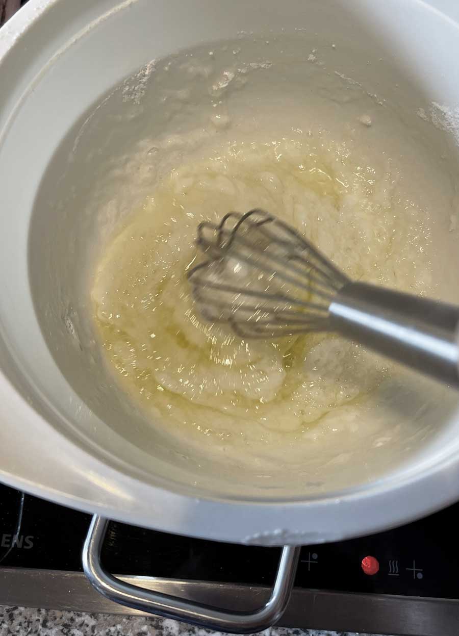 4 Sposób wykonania kremu: wymieszać białko jajka z cukrem pudrem i podgrzać miksturę kąpieli wodnej do ok. 58°C, cały czas mieszając.