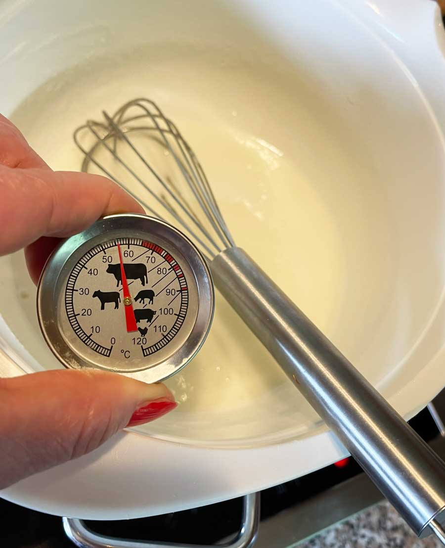 (Jeśli nie masz pod ręką termometru, podgrzej wszystko, aż cukier całkowicie się rozpuści) Upewnij się, że mieszanina nie jest zbyt gorąca, w przeciwnym razie białko jaja zgęstnieje.