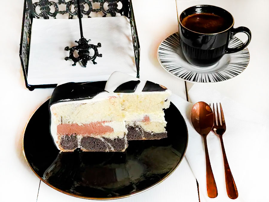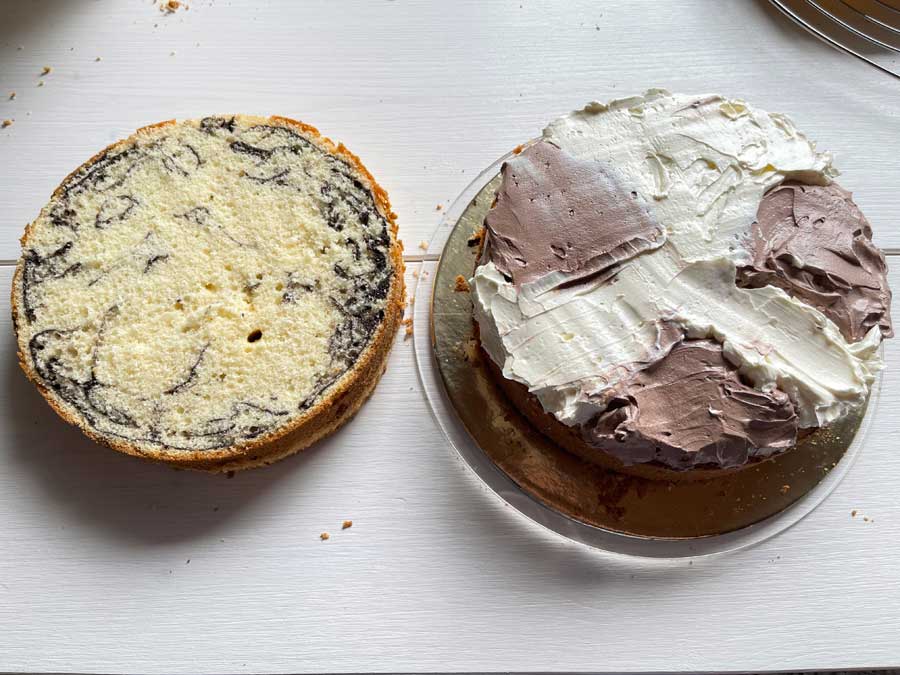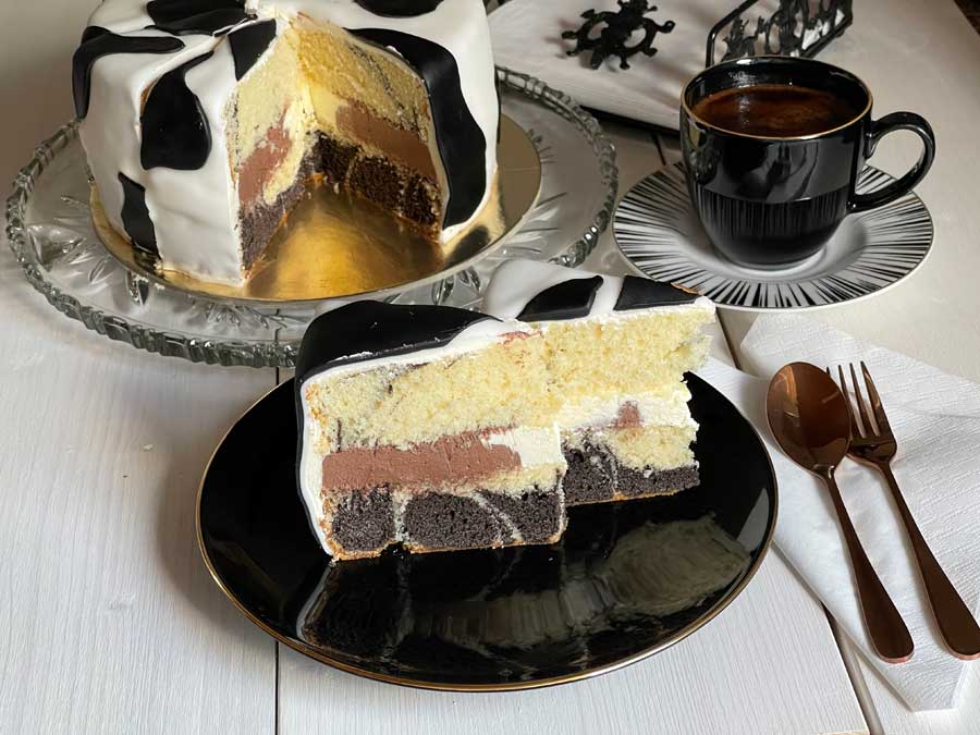 Następnie ułóż na wierzch kolejną warstwę jasnego ciasta i kilka plamek czarnego ciasta. Ostatnią warstwą jest jasne ciasto. Ciasto pieczemy około 1 godziny w nagrzanym piekarniku (grzanie górne/dolne: 170°C). Niech ciasto po upieczeniu dobrze ostygnie.
