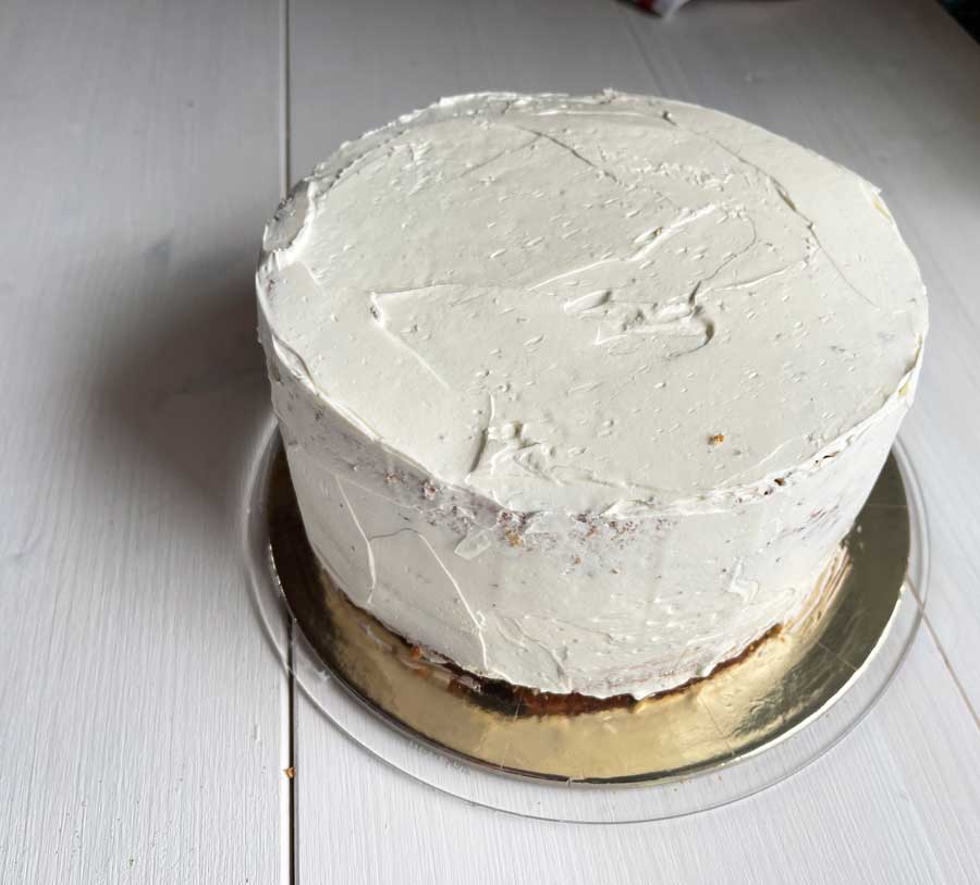 7 Połóż drugą część na wierzchu i rozprowadź resztę jasnego kremu na całym cieście (zdjęcie ).