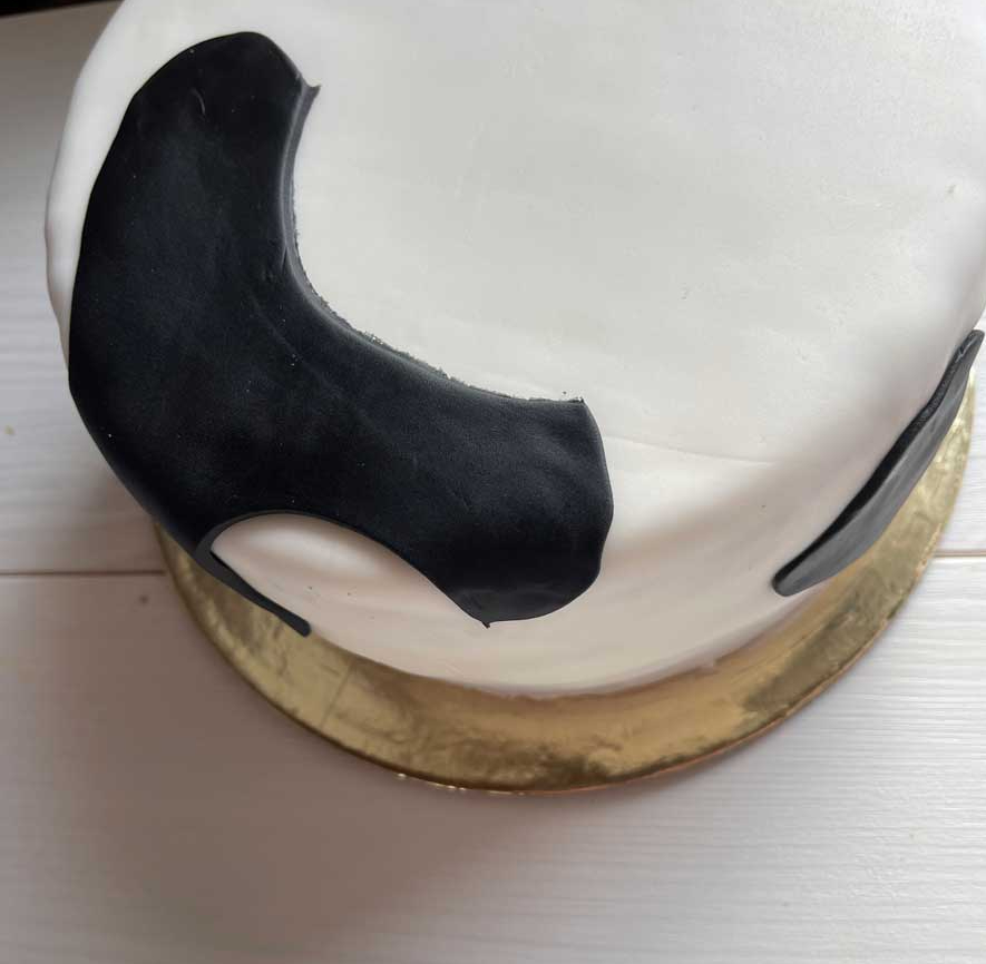 9 Rozwałkować czarną masę i wyciąć nożem, albo foremką plamy byka i trochę je rozciągnąć.
