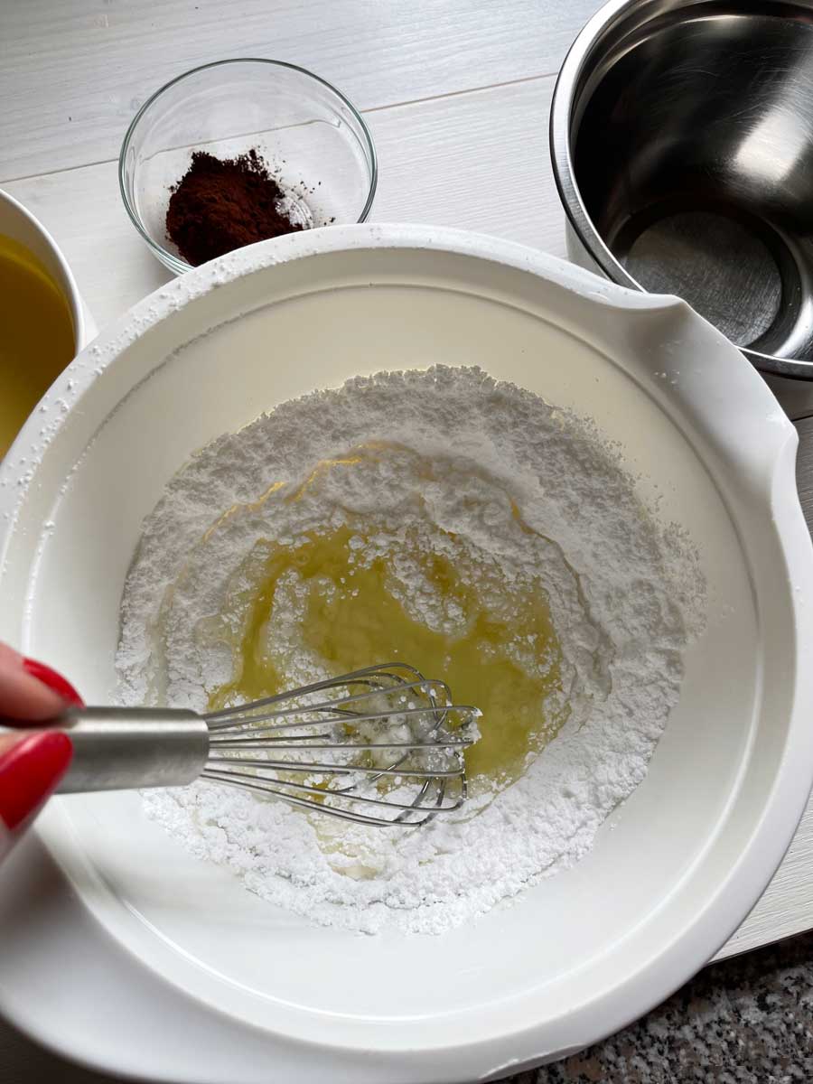 Teraz wlej około 1/3 ciasta do innej miski, dodaj kakao w proszku i pokoloruj ciasto na czarno dodając barwnik spożywczy. Wszystko dobrze wymieszaj.
