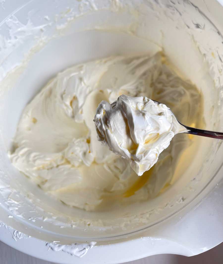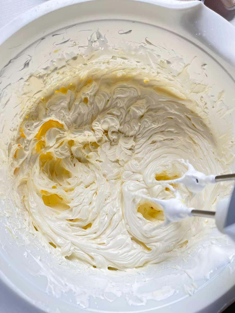 Teraz zatemperowane masło wymieszaj, aż uzyskasz równomierną, kremową masę. Wlej około 1/3 kremu do drugiej miski i zabarw na ciemno kakaem.