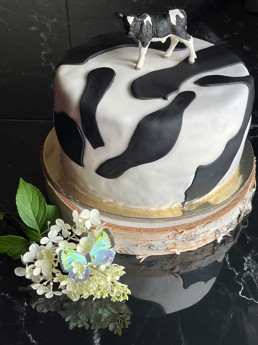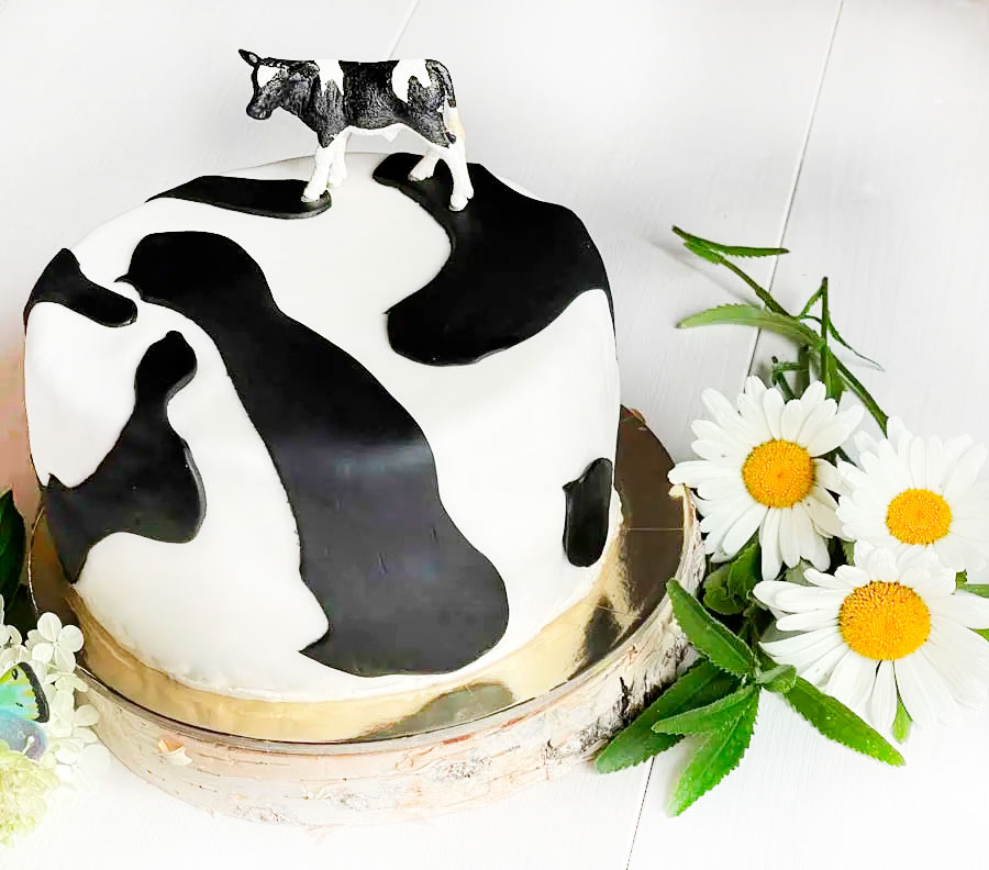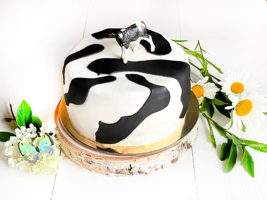 Rozłóż czarne łaty na cieście (foto). W razie potrzeby zwilż je – odrobiną wody, aby lepiej się przykleiły. Na koniec udekoruj ciasto małym zabawkowym bykiem.