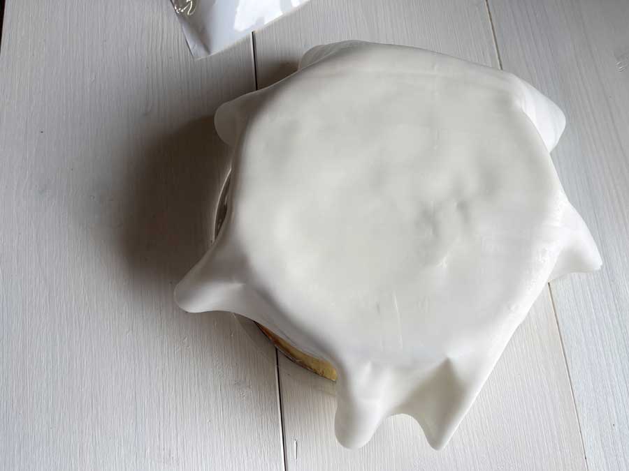 8 Teraz rozwałkuj białą Fondant. Upewnij się, że jest wystarczająco duży płat, aby przykryć całe ciasto łącznie z boczną powierzchnią (foto). Dociśnij masę cukrową/Fondant/ do ciasta i delikatnie wygładź. Możesz odciąć nadmiar masy nożem.