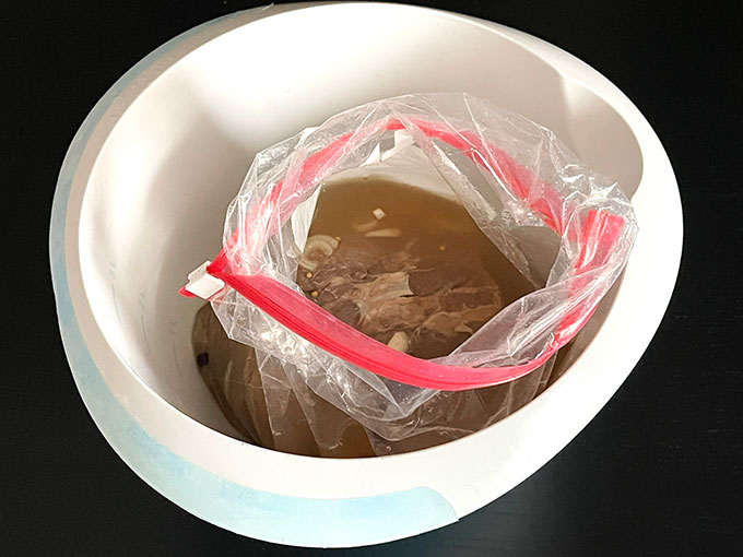 - Umieść mięso w naczyniu i zalej przygotowaną bejcą.