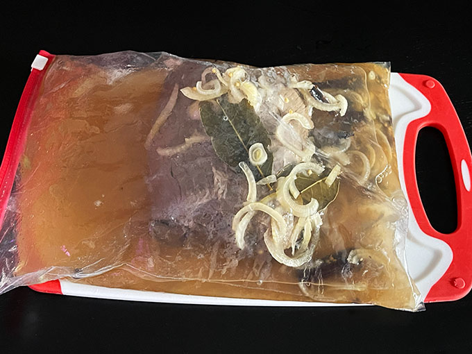 - Przykryj naczynie folią spożywczą i wstaw do lodówki na 3–5 dni. Codziennie obracaj mięso, aby równomiernie się zamarynowało. Sprawdzi się również woreczek z zamknięciem zig zag i wtedy włożyć go wraz z miesem do nieszerokiego naczynia, aby bejca zawsze zakrywała mięso. Łatwiej jest codziennie obracać mięso i umieścić za każdym razem cebulkę i inne przyprawy także na mięsie. Najlepiej jest zrobić to perfekt!